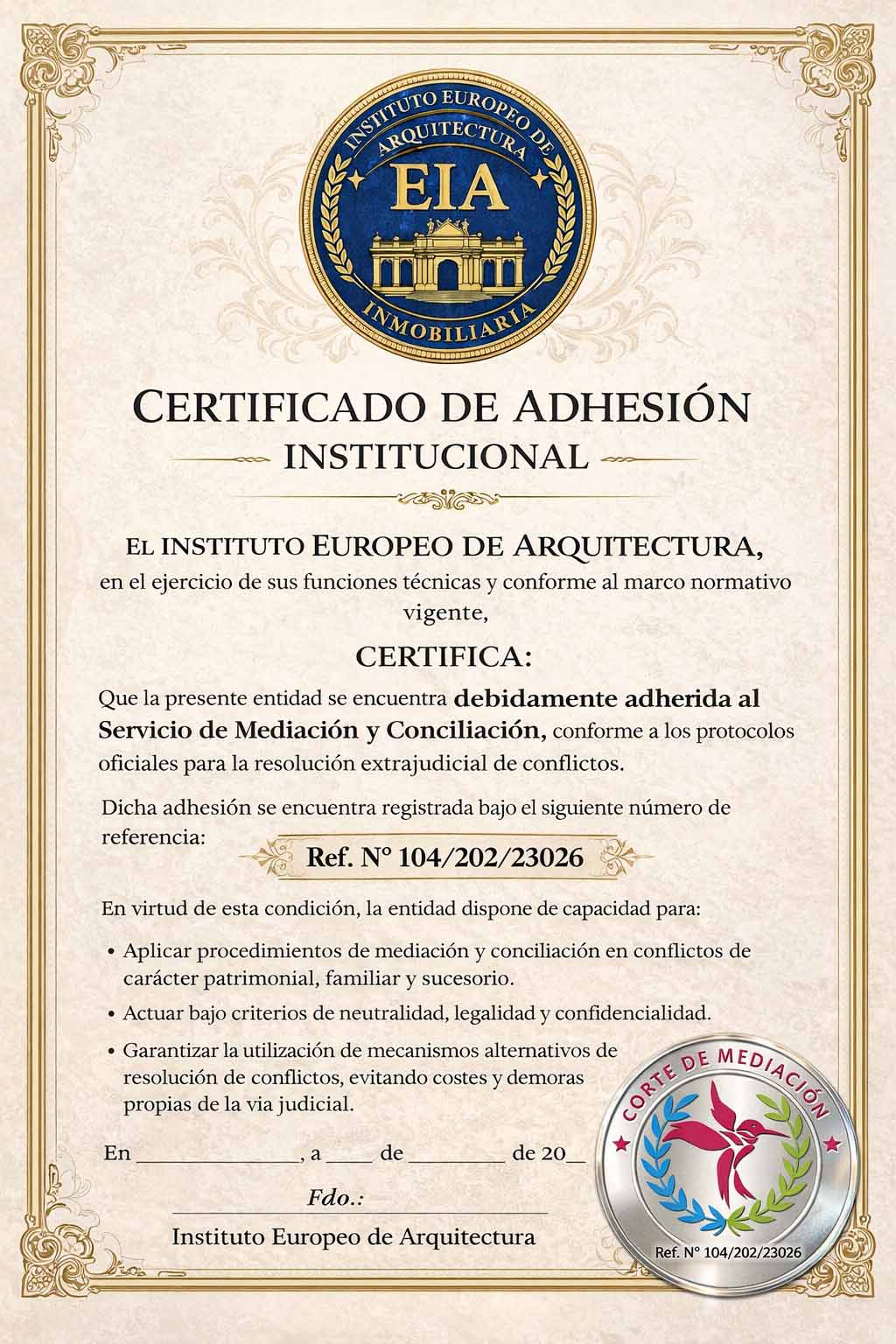 Madrid, 15 de febrero de 2023. El Instituto Europeo de Arquitectura ha formalizado su adhesión al Servicio de Mediación y Conciliación de la Corte de Mediación, una iniciativa que refuerza su compromiso con la seguridad jurídica, la calidad institucional y la búsqueda de soluciones eficaces ante posibles controversias.